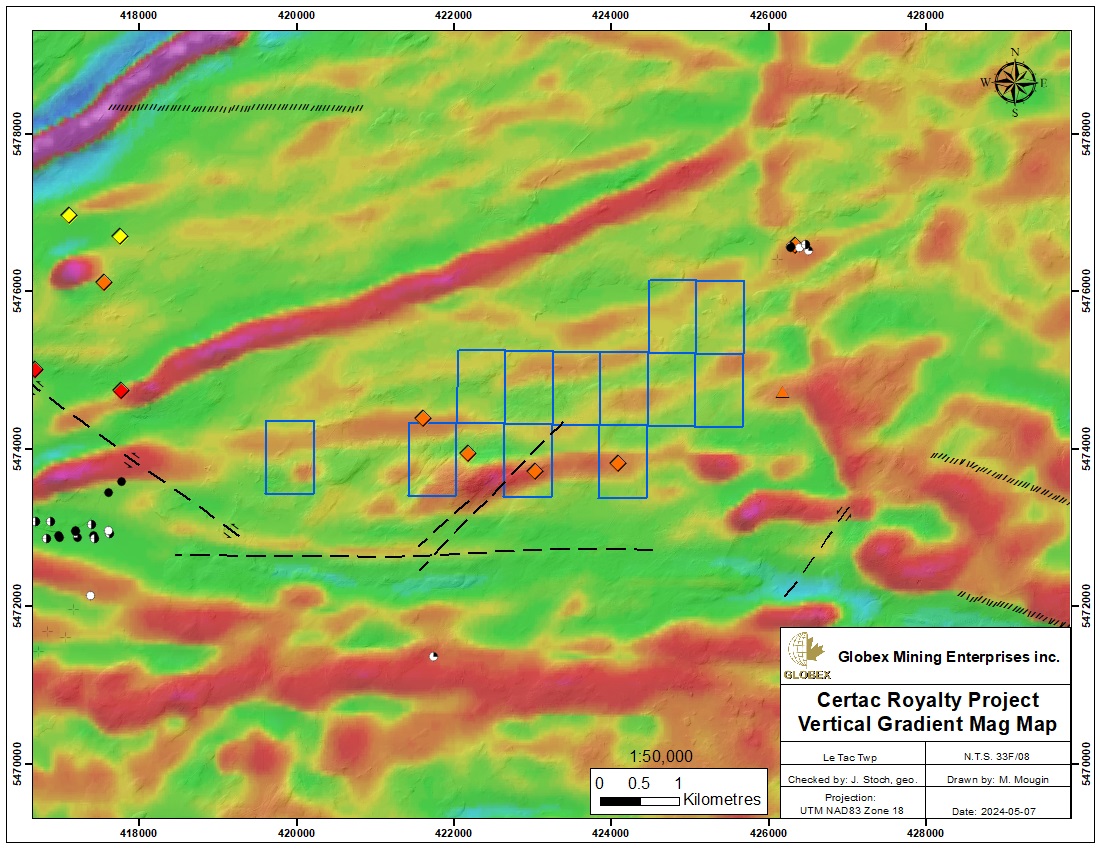 | Référence de localisation : | Le centre de la minéralisation localise le gîte situé à 6.6 km à l’Ouest et à 3.3 km au Sud du coin NE du canton de Le Tac. |