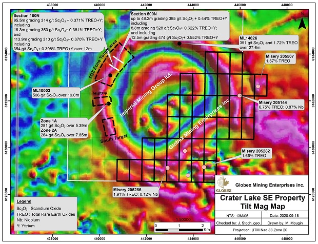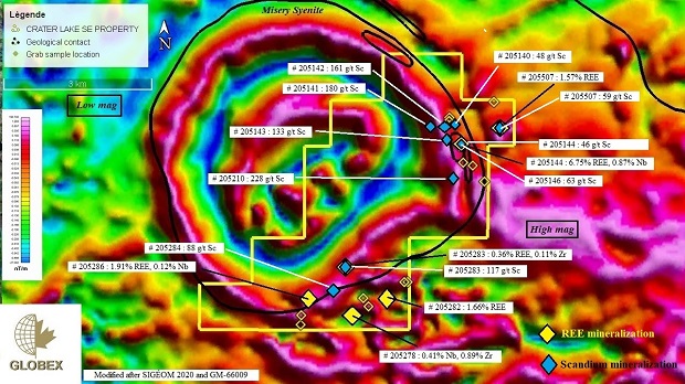 In 2010, Quest Rare Minerals Ltd mapped and sampled their property. Each geologist was equipped with a Radius Solution RS125 spectrometer and when the readings were greater than 700 or 800 counts per second (cps), a sample was systematically collected. A total of 30 grab samples were collected within what is now GSA Crater Lake SE property. Six (6) samples returned interesting REE values: sample #205144 returned 6.75% REE, 0.87% Nb and sample #205286 returned 1.91% REE, 0.12% Nb. Their locations are shown on figure 2. Several samples returned > 100 g/t Sc, sample # 205141 returned 180 g/t Sc, sample # 205142 returned 161 g/t Sc, sample # 205143 returned 133 g/t Sc, sample # 205210 returned 228 g/t Sc, sample # 205283 returned 117 g/t Sc. All of these samples are located along the very high magnetic ridge located in the central portion of the mag anomaly, as what Imperial has noticed during their 2010-2020 exploration work. This is the only work performed within the limits of GSA’s property (2010 – GM-66009).