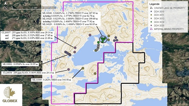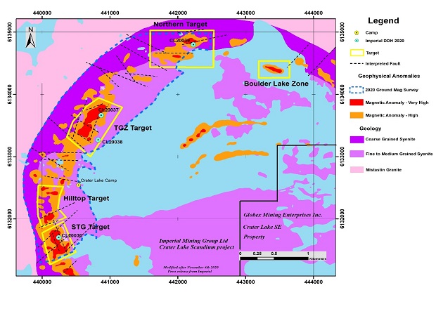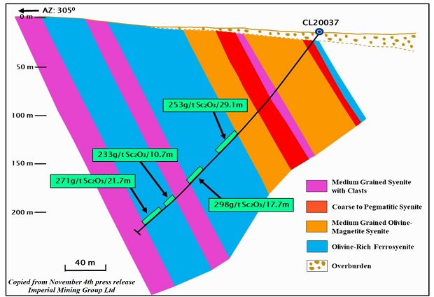 The exploration work conducted by Quest Rare Metals Inc and subsequently by Imperial Mining Group Ltd, since 2010, on their Crater Lake Scandium project located in northeastern Quebec has revealed a great potential for the discovery of new REE-scandium-niobium mineralization and to extend the presently known mineralized TG and STG zones. A new detail magnetic survey has identified two new high priority targets just south of the STG zone and as better defined the very high magnetic areas within broader and weaker magnetic areas (Figure 7). In 2020, such very high magnetic features were drilled and returned significant intersections of scandium rich ferrosyenite within a package of medium grained syenite. Figure 8 shows the cross section of hole CL20037.