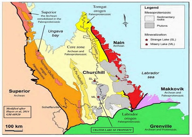 The Crater Lake SE property is located within what is termed the core zone of the Churchill Province (Figure 4). This geological province is bounded to the west by the Superior Province (2.78 – 2.64 Ga) and to the east by the Nain Province (3.8 – 2.3 Ga). The core zone is comprised mostly of reworked Archean rocks, which are juxtaposed against the Labrador Trough, to the west.