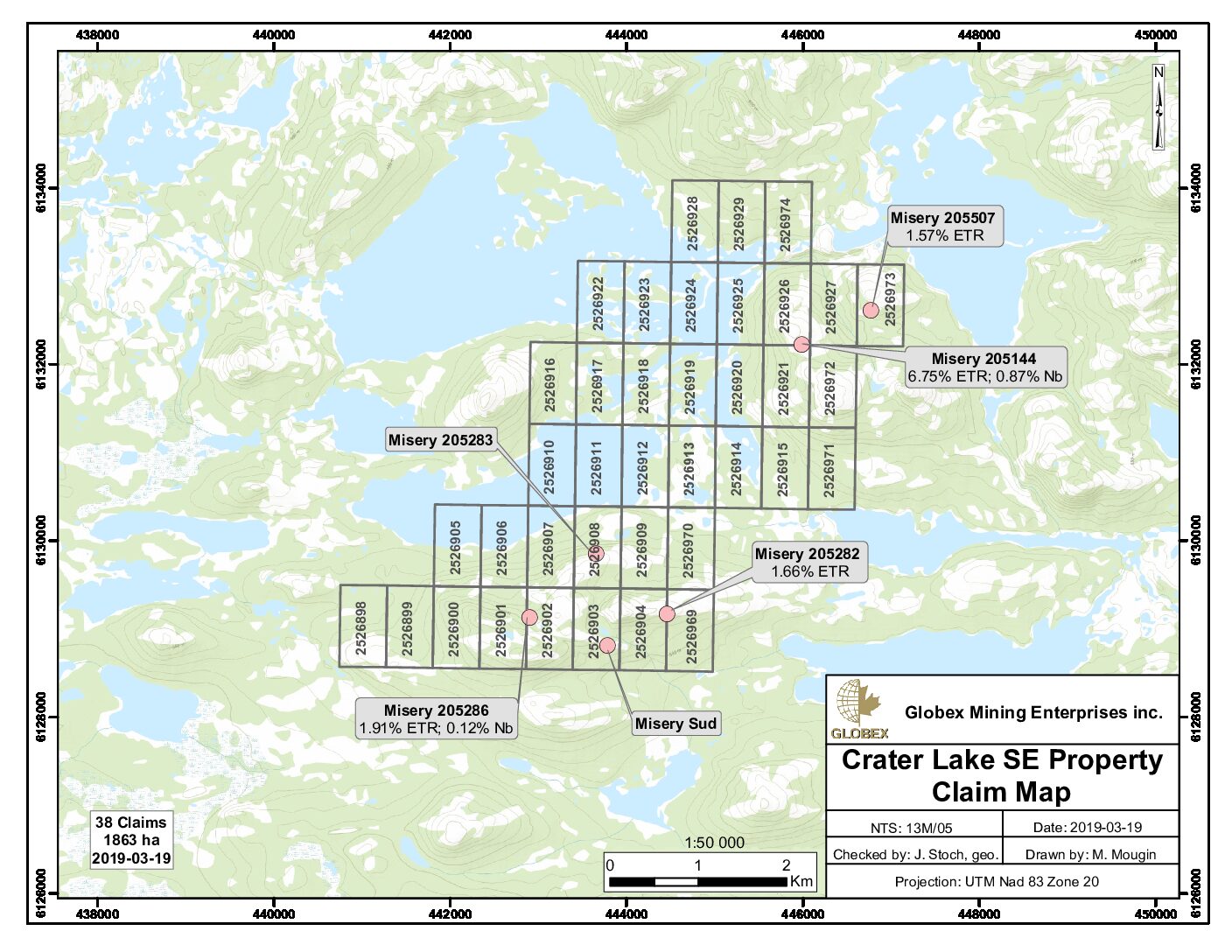 The Crater Lake SE property consists of 38 contiguous claims totaling 1,863.45 hectares located in NTS 13M/05, approximately 1,300 km NNE of Montreal and 200 km ENE of Schefferville northeastern Quebec (Figure 1). Access to the property is restricted to fixed wing aircraft or helicopter. Drilling is achieved with helicopter support. Topography is comprised of gently rolling hills with local steep cliffs which rise between 500 and 650 metres above mean sea level (Figure 1).