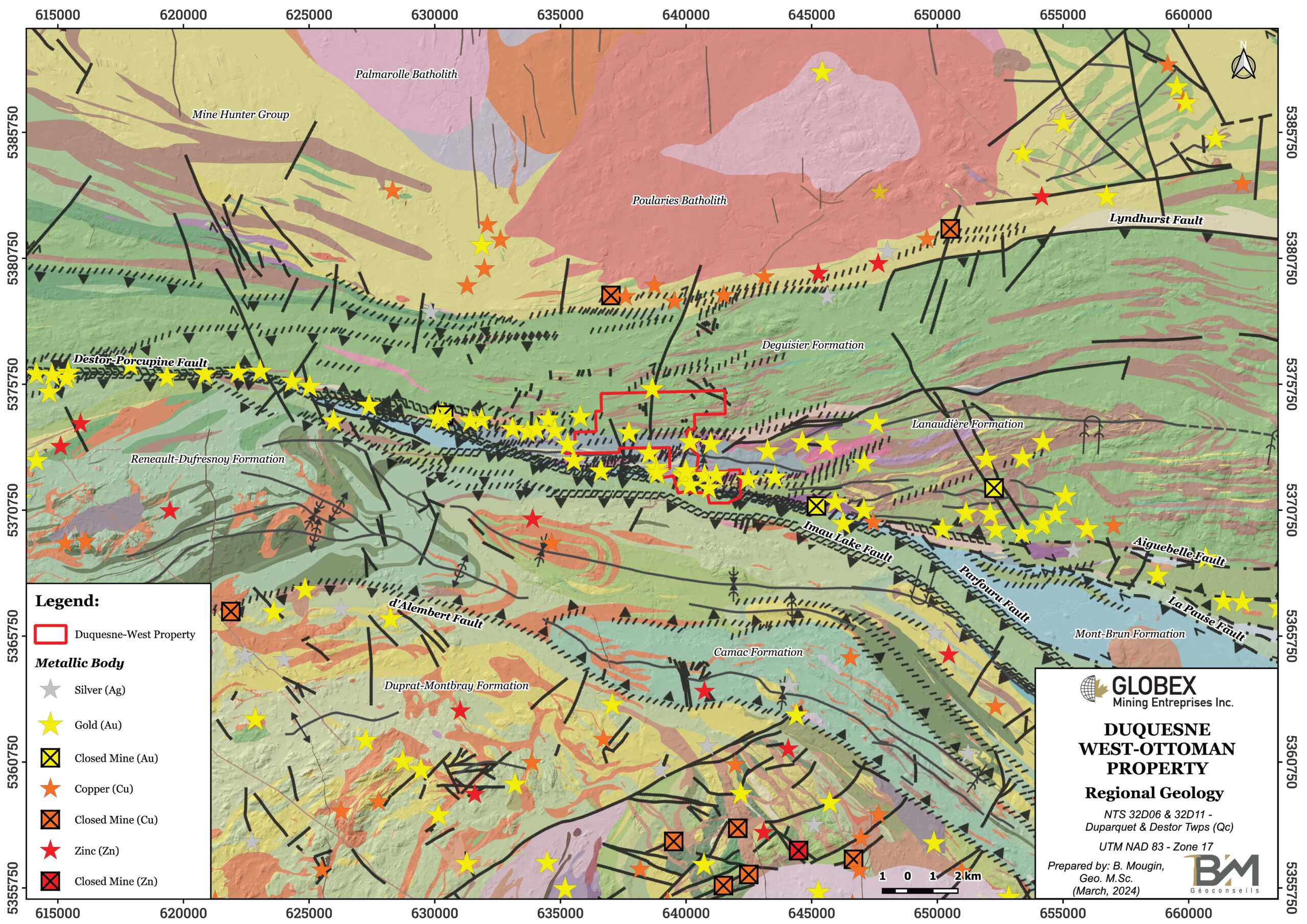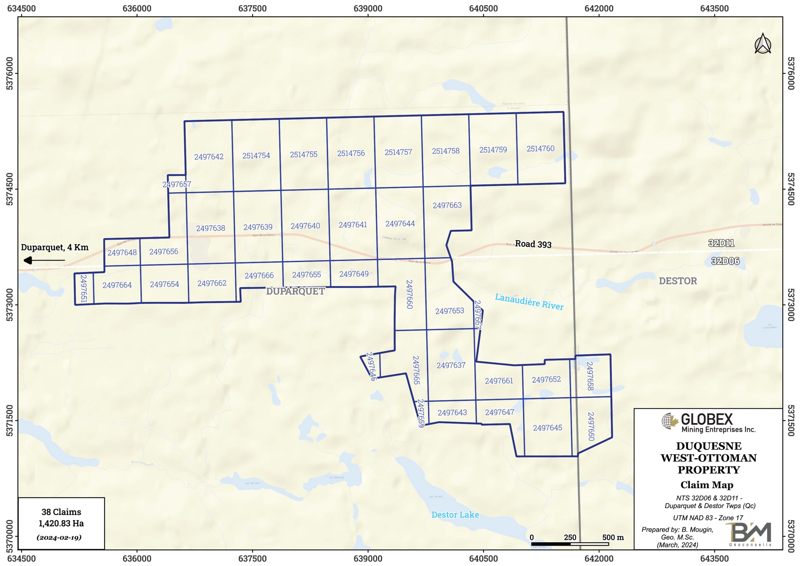 The Duquesne West/Ottoman Property is comprised of 38 claims totalling 1420ha located 32 km northwest of the mining town of Rouyn-Noranda and 10 km east of the town of Duparquet in Duparquet Township, northwestern Quebec. The property is readily accessed by vehicle along gravel roads originating from Highway 393 roughly 4.5 km west of Highway 101. A series of ATV trails and various drill roads provide further access throughout most of the property. The Property is held 100% by Duparquet Assets Ltd. (‘DAL’), a company owned 50% by GSA and 50% by Jack Stoch Geoconsultant Services Limited (‘GJSL’) a company owned by Jack Stoch, President & CEO and Director of GSA.
