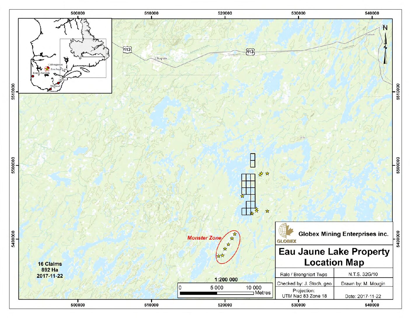 The Eau Jaune Lake Property is located in Rale – Brongniart Townships, in the Chibougamau district of Northern Quebec. The property consists of 16 claims totalling 892 hectare and is 100% owned by GSA Mining Enterprises Inc.