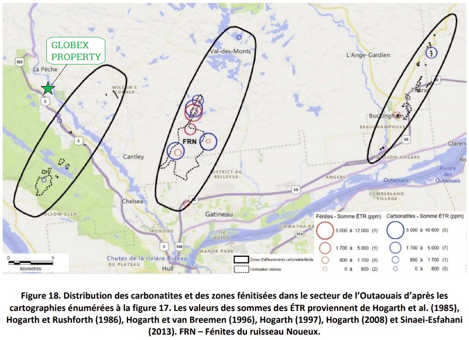 In 2021, Quebec Ministry of Natural Resources and Forests (MNRF) undertook a sampling campaign of carbonatite dikes in the Outaouais area (MB 2022-01) and identified a REE-anomalous carbonatite dyke passing just south of the Maxwell Property.