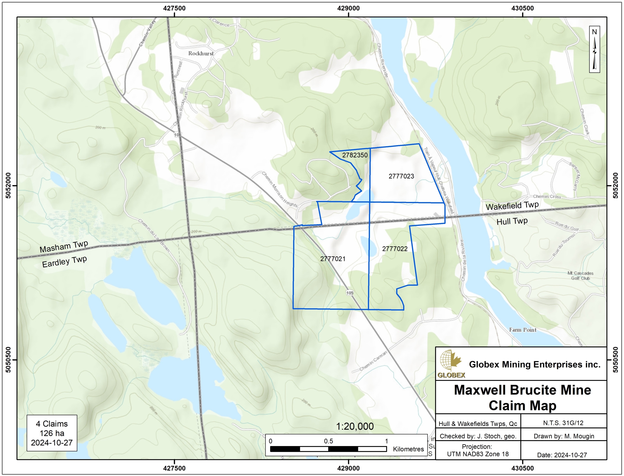 The Maxwell Property of GSA is located in the Outaouais Region of Quebec Province, in the town of Wakefield, within Hull and Wakefield townships. It is around 15 km linear northwest from Chelsea (Qc) and 25 km north-west from Ottawa (On). The property is composed of four (4) contiguous claims totalling 126.61 ha in Hull and Wakefield Townships. Claims are fully held by GSA and are not subject to any third part interests.