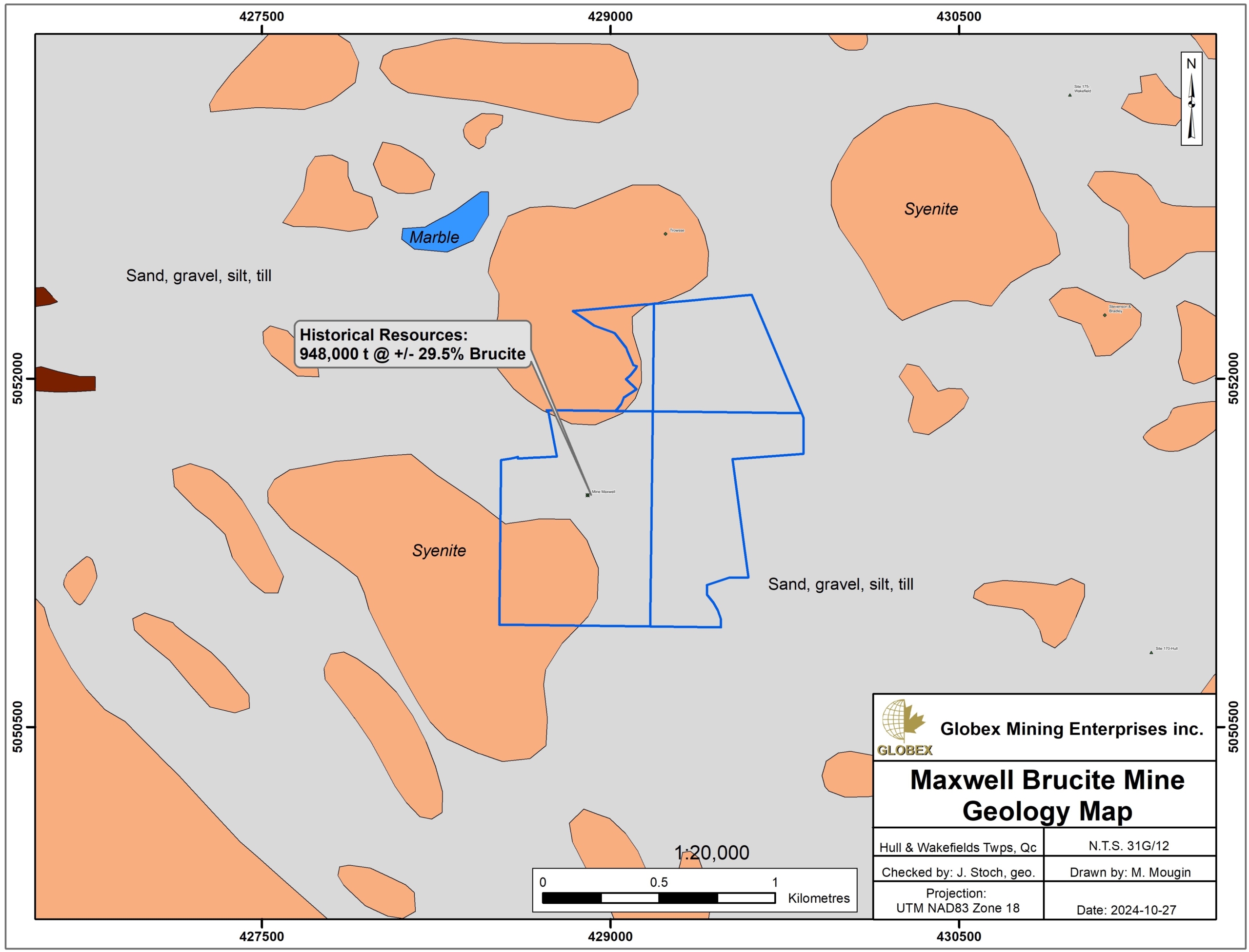 A total of 4 418 000t of unknown grade brucitic (±calcite ±serpentine) ore has been extracted by Aluminium Company of Canada from both Maxwell and Cross Mines between 1941 and 1967. The Cross Mine is located 2.5km south-east from Maxwell Mine. The hostrock is a crystalline marble hosted in a syenite. Brucitic marble forms horizons containing up to 30% brucite in shreds of marble isolated within the Wakefield syenite (MB 89-18). Public data of Sigeom suggests a remaining Historical Resource of 948 000t of brucitic marble in the Maxwell Mine (DV 85-08).