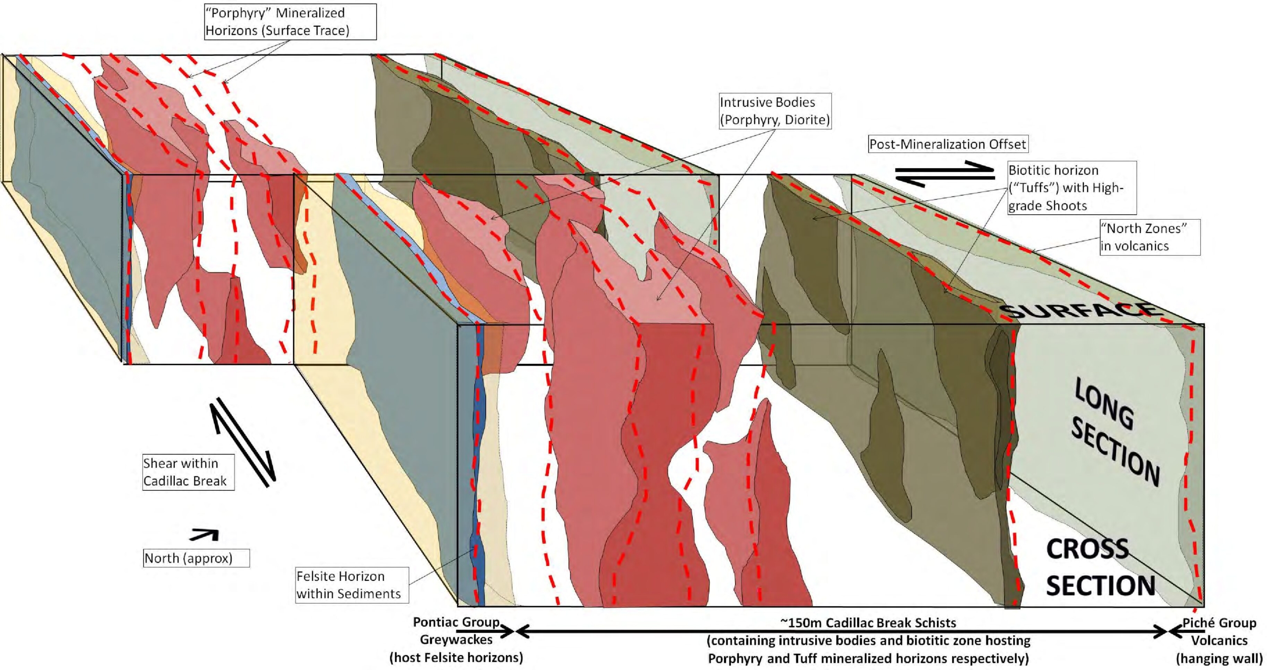 The main mineralized zones occur throughout a series of stratigraphically continuous mafic lapilli tuff horizons lying south of the northern contact of the Cadillac Break and within fractured, quartz veined and silicified areas of the dioritic and feldspar-porphyry intrusive bodies. Mineralization has also been noted in silicified, brecciated and bleached sections of the greywacke along the southern contact of the Break. Further indications of mineralization occurring along the sheared northern contact of the volcanic sequence may represent a major splay fault off of the main Cadillac Break.