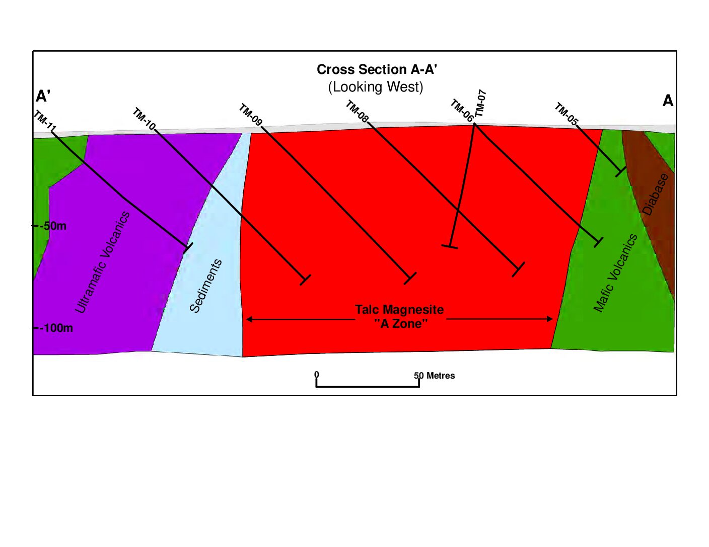 The area is underlain by Archean aged intrusive, volcanic and sedimentary rocks including large masses of altered ultramafic volcanic lithologies and at least one east-trending diabase dyke.  Strike directions of units are generally east-west, with near vertical dips.  The magnesite-talc-quartz rock unit is exposed on surface as large areas of outcrop rising 3 to 6 metres (‘m’) above a sand plain floor.