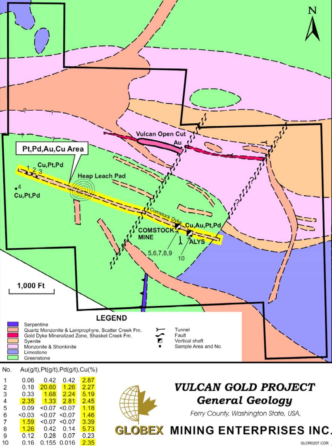 Early exploration and mining took place near the turn of the century on the Vulcan property. Small amounts of high grade copper ore were hand-cobbed from the Comstock Vein and shipped directly to the smelters. Exploration for gold on the property and surrounding areas took place on an intermittent basis. This consisted of various forms of sampling and drilling, and at least two small audits into the Gold Dike Vein. The property came under the control of Vulcan Mountain Mining Company, which commenced to mine the Gold Dike by open-pit methods. Approximately 150,000 tons of ore were extracted and processed using cyanide heap leaching to extract the gold from the ore with an average recovered grade of approximately 0.10 opt gold and 0.15 opt silver. Diamond drilling on the property has occurred intermittently since 1963. During 1996, GSA completed geological mapping and induced polarization surveys on the claims, as well as 14 diamond drill holes completed for a total length of 7,272 feet. These efforts were followed by surface sampling in 2002 which located significant platinum, palladium, gold and copper valves in a porphyry body parallel to the Vulcan Zone.