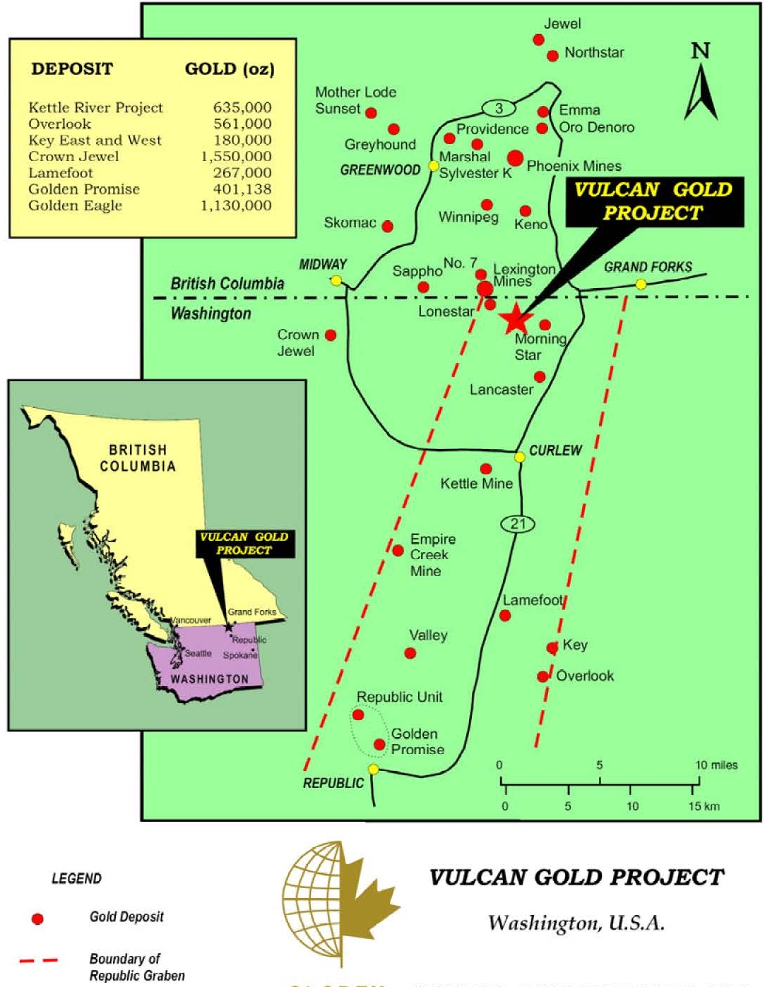 The Vulcan property, also known as Gold Dike, is located in Ferry County, Washington, two miles (3 km) from the Canada-United States border and four miles (6 km) southwest of Grand Forks, British Columbia. The property consists of 8 patented claims, 34 unpatented claims, and 11 optioned unpatented claims.